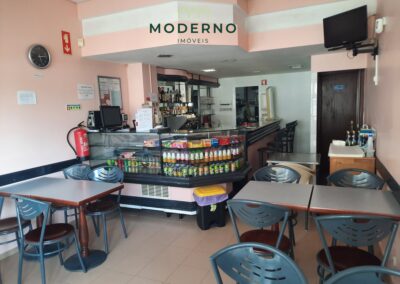 A fração B, onde atualmente funciona o café, tem uma área de 48m2 e o espaço dispõe de casas de banho, cozinha equipada, sala com balcão, vitrine, bancada com máquina de café e máquina registadora, mesas e cadeiras.